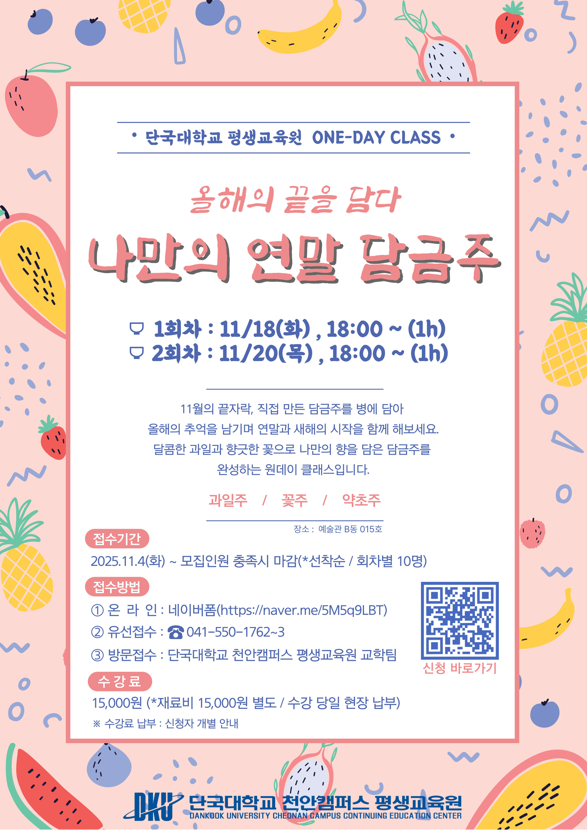 < 강좌 안내 > - 강좌명 : 올해의 끝을 담다 - 나만의 연말 담금주 - 교육일정 및 장소 (1회차) 2025년 11월 18일(화) 18:00~ / 예술관 B동 015호 (2회차) 2025년 11월 20일(목) 18:00~ / 예술관 B동 015호 - 교육내용 : 달콤한 과일과 향긋한 꽃으로 나만의 담금주 만들기 (과일주, 꽃주, 약초주) - 담당 강사 : 신예빈 (담금주공방 체험강사) - 수강료: 15,000원 (※ 재료비 15,000원 별도)