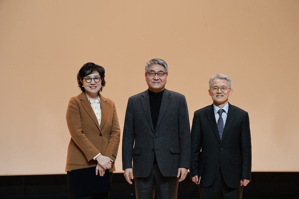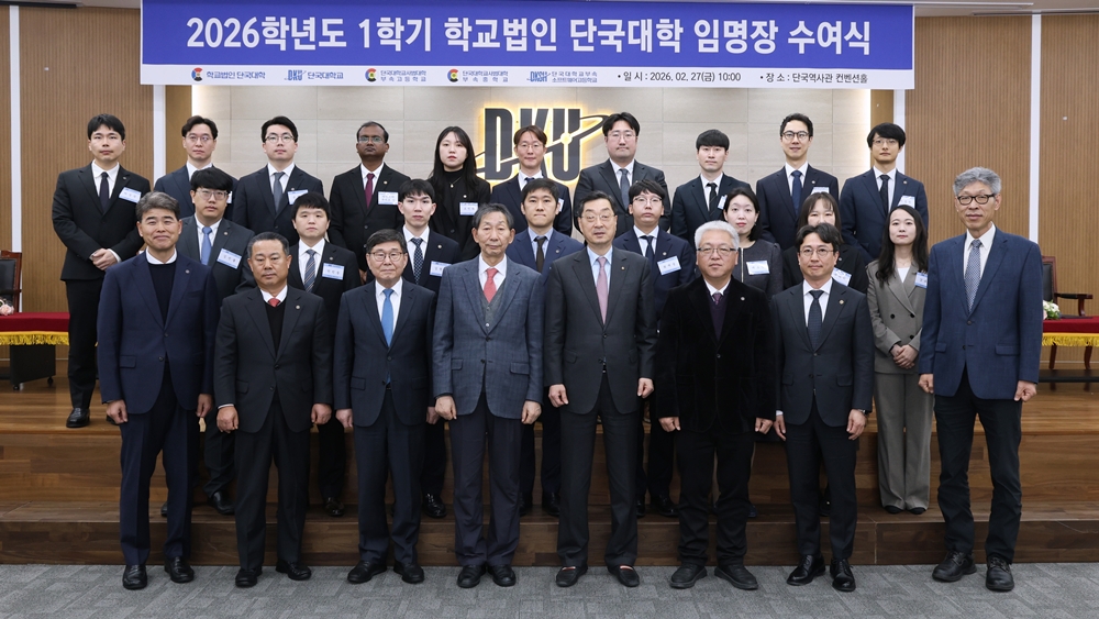 장호성 이사장이 27일(금) 단국역사관 컨벤션홀에서 신규 임용 교직원 및 보직 선임자 58명에게 임명장을 수여하며 대학 발전을 위한 새로운 도약을 다짐했다. 임명장을 받은 교직원은 ▲신규 임용 교원 18명 ▲신규 임용 직원 15명 ▲보직 선임 및 직급 승진자 25명 등 총 58명이다. ▲신임 교직원·보직자 임명장 수여식이 단국역사관 컨벤션홀에서 열렸다. 장호성 이사장은 “대학 발전을 위해 한마음 한뜻으로 교육과 연구, 행정에 매진해 달라”며 “AI와 디지털 전환이 교육의 패러다임을 바꾸고 있는 지금, 변화를 두려워하지 말고 AI 활용 등 새로운 기술을 교육·연구·행정에 능동적으로 접목해 대학 혁신을 이끄는 주역이 되어 달라”고 당부했다. 안순철 총장은 “새롭게 단국 가족의 일원이 된 신규 임용 교직원 여러분께 진심으로 감사와 환영의 뜻을 전한다”라며 “치열해지는 대학 생존 경쟁 속에서 지속 가능한 대학으로 나아가기 위해 최상의 교육·연구와 행정에 모두가 한마음으로 노력해 주기 바란다”라고 강조했다. ▲신규 임용 전임교원 기념사진 ▲신규 임용 직원 기념사진 ▲보직 및 직급 승진 기념사진