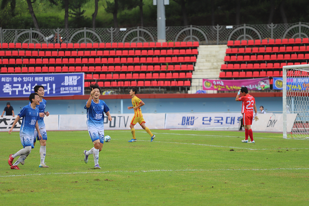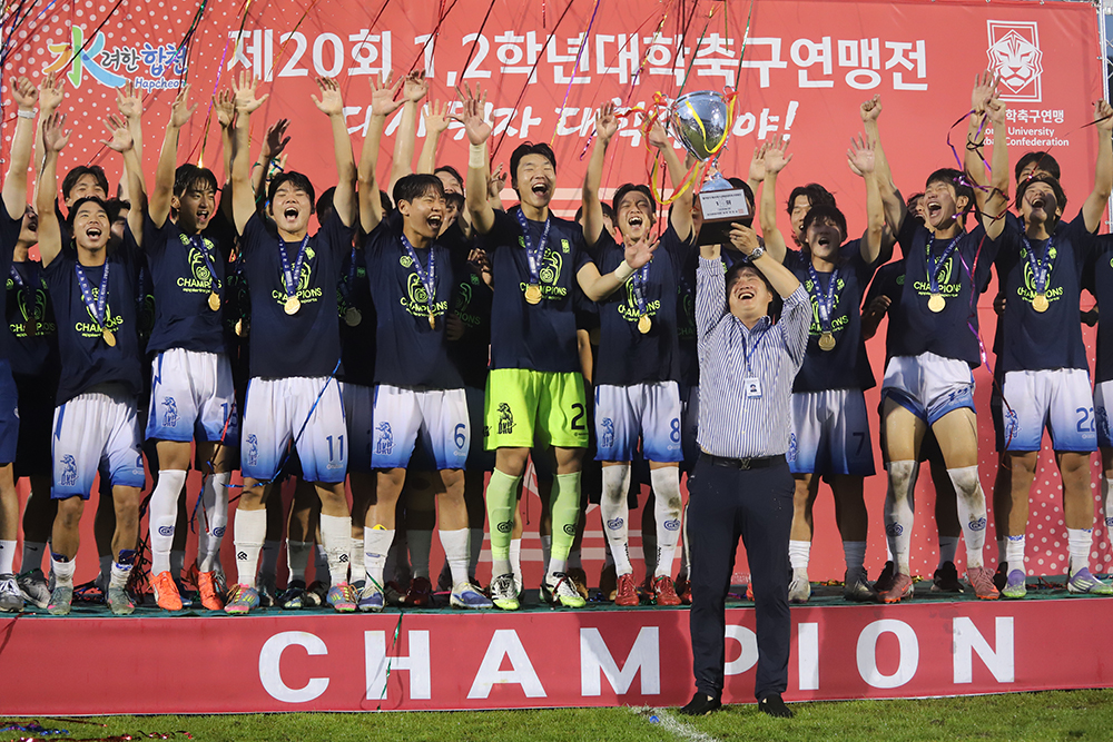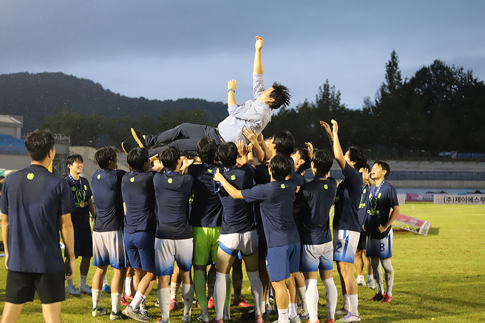 지난 8월 31일 경남 합천공설운동장에서 열린 결승전에서 우리 대학은 광주대학교를 상대로 2-0 승리를 거뒀다. 전반 15분 주장 조민서가 중거리 슈팅으로 선제골을 기록했고 후반 19분 교체 투입된 이윤성이 추가골을 터뜨리며 승부에 쐐기를 박았다. 앞서 우리 대학은 조별예선에서 △세경대(1-0) △김천대(2-0) △우석대(5-2)를 차례로 꺾으며 조 1위로 본선에 올랐다. 본선에서는 △장안대(16강, 2-1) △홍익대(8강, 승부차기 7-6) △구미대(4강, 2-0)를 차례로 제압하며 결승 무대에 올랐다. 특히 홍익대와의 8강전에서는 0-0 무승부 이후 승부차기 접전 끝에 승리하며 팀의 뚝심을 보여줬다. 이번 대회는 악천후 속에서도 치러졌으나 선수들은 조직적인 압박과 정교한 패스로 경기 흐름을 장악하며 안정적인 경기력을 선보였다. 광주대의 거센 반격에도 골키퍼 강태웅의 선방과 견고한 수비가 빛을 발하며 무실점 승리를 완성했다.