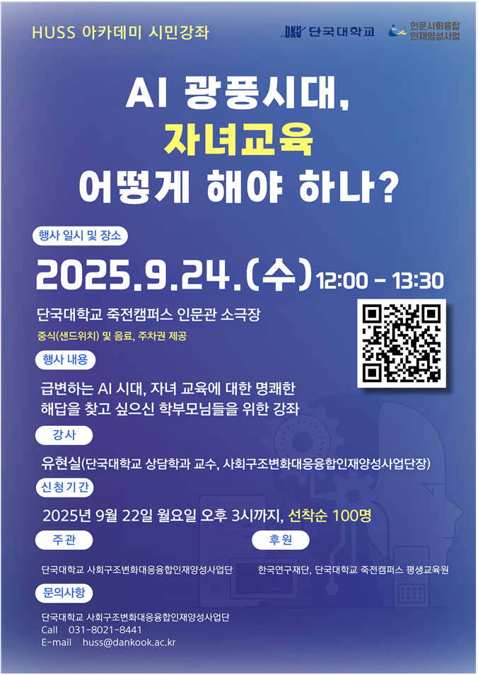 사회구조변화대응융합인재양성사업단(단장 유현실, 이하 사업단)이 사회과학대학생회와 함께 토론대회 ‘DAD(Dankook Apple Debate)’와 HUSS 아카데미 시민강좌 「AI 광풍시대, 자녀교육 어떻게 해야 하나?」를 연이어 개최하며 큰 호응을 얻었다. 지난 23일(화) 죽전캠퍼스 학생극장에서 열린 사회과학대학 토론대회 ‘DAD(Dankook Apple Debate)’에서는 구독자 281만명을 보유한 인기 유튜버 정재형(피식대학 채널)씨가 특강을 진행해 학생들의 열띤 반응을 이끌었다. 이어 토론대회는 ‘대한민국은 경제적 이익 및 안보 외교보다 인권 외교를 우선시해야 한다’는 주제로 찬반 토론이 펼쳐졌다. 대회 결과 ▲최우수상은 나노팀[나수현(법학과 4학년), 노하늘(법학과 3학년)] ▲우수상은 정승제팀[이정미(기계공학과 2학년), 신승태(법학과 2학년)]이 수상했다. 이어 24일(수)에는 죽전캠퍼스 인문관 소극장에서 아카데미 시민강좌 「AI 광풍시대, 자녀교육 어떻게 해야 하나?」를 개최했다. 이번 강좌는 급변하는 AI 환경 속에서 자녀교육의 새로운 방향을 모색하고자 기획됐다. 강연자로 나선 유현실 단장(상담학과)는 AI 시대에 필요한 5가지 힘으로 적응력, 탐험력, 질문력, 교감력, 결정력을 제시하며 “AI가 대체할 수 없는 인간 고유의 역량을 길러야 한다”고 강조했다. 유현실 단장은 “학부모·학생·지역사회가 함께 소통하고 배우는 이번 프로그램을 계기로, 앞으로도 사회 변화에 능동적으로 대응할 수 있는 다양한 융합 교육 콘텐츠를 마련하겠다”고 밝혔다. |