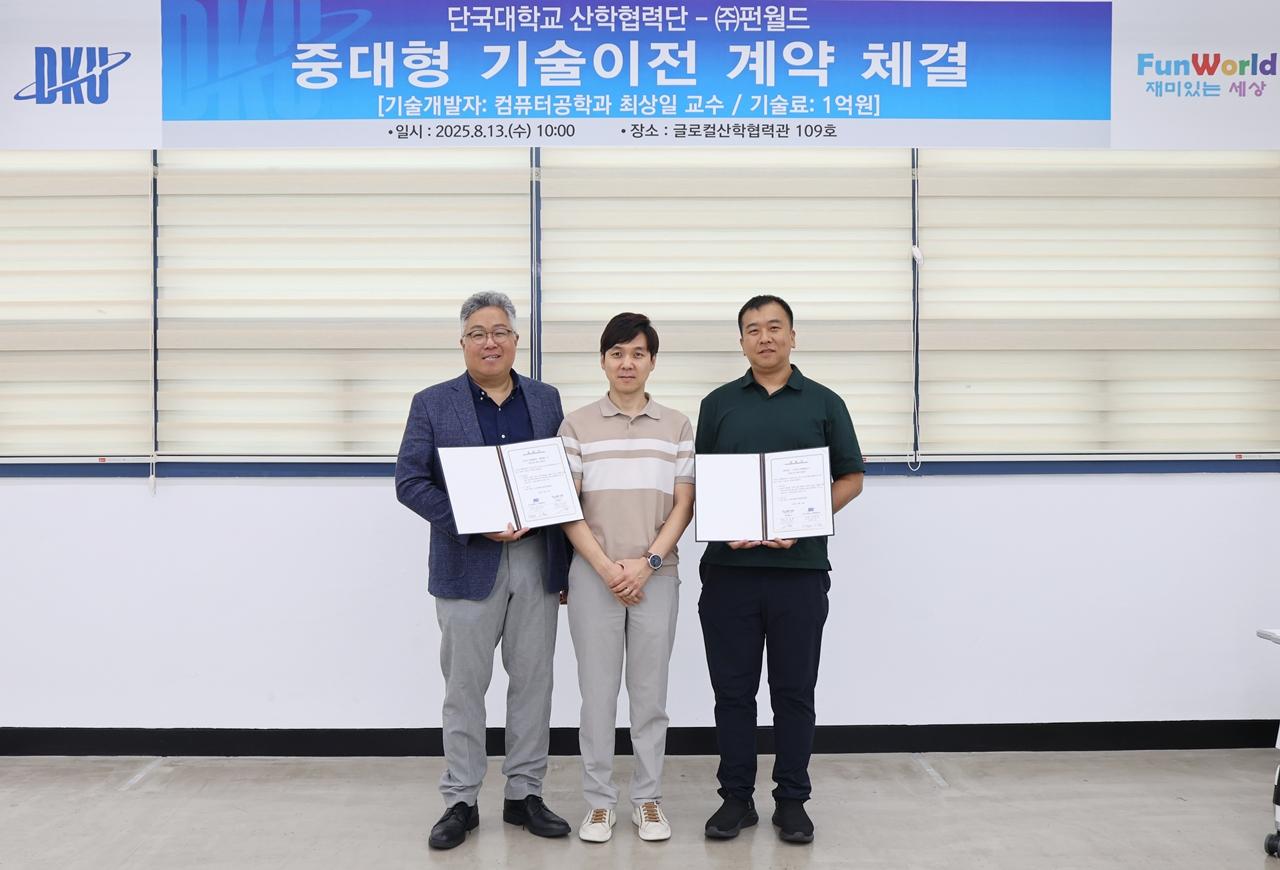 최상일 교수(컴퓨터공학과) 연구 성과 ‘스마트 인솔 데이터 처리기술 상용화·고도화’ 작년에 이어 누적 기술 이전료 2.6억 원 달성 “헬스케어 혁신 이끌어” 산학협력단(단장 조완제)이 지난 13일(수) IoT스마트헬스케어 전문기업인 ㈜펀월드(대표 유경환)와 보행 패턴을 분석해 뇌졸중, 파킨슨병을 조기 진단할 수 있는 ‘스마트 인솔(깔창) 데이터 처리기술 상용화 및 고도화’를 위한 중대형 기술이전 계약을 체결했다. 이번에 이전된 기술은 최상일(컴퓨터공학과) 교수가 개발한 「딥러닝 앙상블 기반의 보행 패턴을 이용한 사용자 식별을 위한 멀티모달 퓨샷 학습 장치」 외 1건이다. 기술이전료는 총 1억 원이며, 지난해에 이어 누적 기술 이전료는 총 2.6억 원에 달한다. ▲ 기술이전 계약 체결 기념 사진(왼쪽부터 조완제 산학협력단장, 최상일 교수, 유경환 ㈜펀월드 대표) ▲ 산학협력단과 IoT스마트헬스케어 전문기업인 ㈜펀월드가 기술이전 계약을 체결하고 기념 촬영을 했다. 이전 기술은 스마트 인솔에 내장된 압력 센서와 6축 IMU(관성측정장치) 센서로 보행 데이터를 수집한 뒤, 인공지능(AI)을 활용해 보행 패턴을 분석하는 방식이다. 기술은 보행 패턴으로 사용자 식별, 보행 타입 분류, 보행 시 좌우 균형 분석 등이 가능하며, 딥러닝 기술 고도화를 통해 실시간 보폭 추정 기능까지 구현할 수 있다. 유경환 대표는 “스마트 인솔은 신발과 휴대폰만으로 개인 맞춤형 보행 분석이 가능하며, 일상적인 보행 패턴을 장기간 추적·관찰할 수 있다”라며 “이전 기술을 활용해 건강 모니터링 서비스와 맞춤형 재활치료 솔루션을 개발해 새로운 헬스케어 비즈니스 모델을 창출할 계획이다”라고 밝혔다. 조완제 산학협력단장은 “단국대는 우수한 기술력과 연구자를 기반으로 지·산·학 협력을 확대하고, 기술 상용화를 통해 사회적 가치를 창출하는 성과를 지속해 나가겠다”라고 밝혔다. #단국대 #산학협력단 #기술이전 #최상일교수 #스마트인솔 #㈜펀월드 [대학뉴스 제보] 죽전 홍보팀 : 031-8005-2032~5, 천안 홍보팀 : 041-550-1061